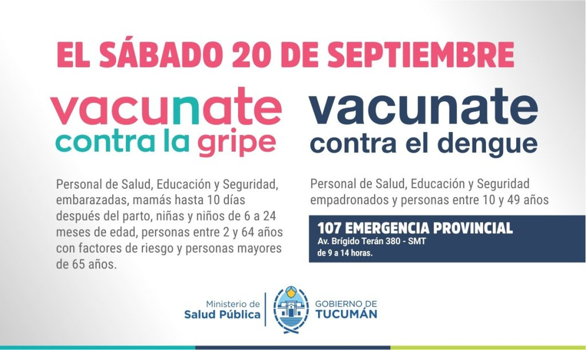 Este sábado 20 de septiembre el Ministerio de Salud Pública de Tucumán, a cargo del doctor Luis Medina Ruiz, llevará adelante una nueva jornada de vacunación gratuita, destinada a prevenir dos enfermedades estacionales: la gripe y el dengue. La actividad se desarrollará de 9 a 14 horas en la Dirección de Emergencias 107, ubicada en Avenida Brígido Terán 380, San Miguel de Tucumán.