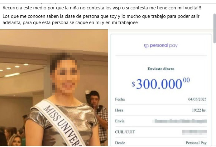 "Aquí le presento a Y.T, de la ciudad de Alberdi, Miss Deudora, La Reina de Las Cagadoras. Se hace la buena persona, se la da de amiga y como persona es una mierda. El 4 de Mayo me saco prestado 300 mil pesos que necesita porque tenía un problema su mamá y hasta el día de la fecha no me pudo devolver un peso", denunció el DJ.