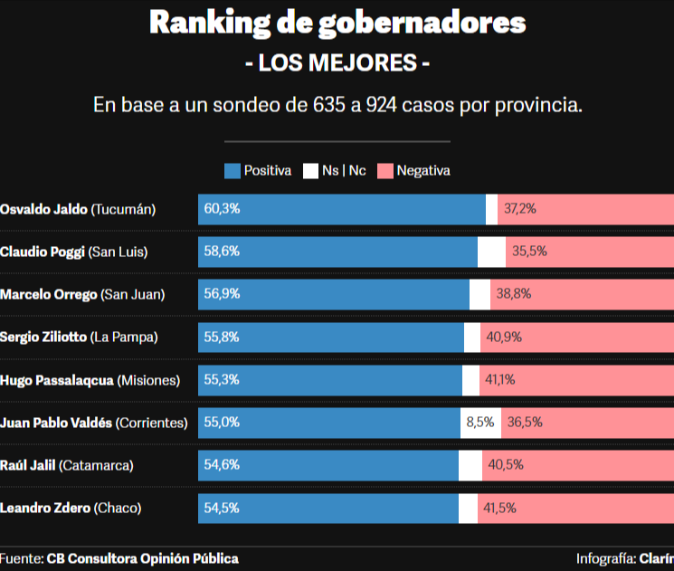 El gobernador de Tucumán es seguido por Claudio Poggi (San Luis), con un 58,6%; y en tercer lugar Marcelo Orrego (San Juan), con un 56,9% de aprobación".
