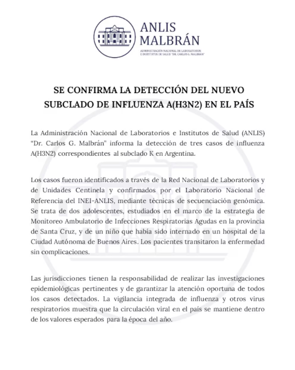 El Instituto Malbrán confirmó este viernes la detección de tres casos del subclado K de la gripe A (H3N2) en nuestro país, luego de que reportaron contagios en Perú, Colombia y Chile.