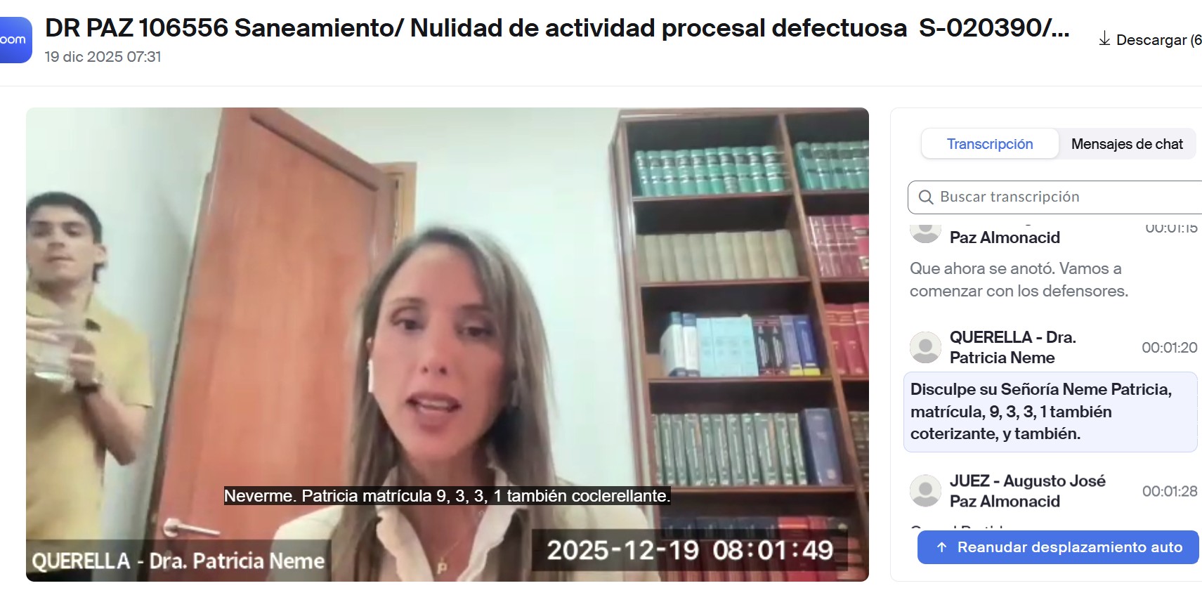 Patricia Neme presentó un escrito la noche anterior. El asistente del juez lo leyó a las 08:02: "Licencia profesional Colegio de Abogados desde el día 23 de diciembre hasta el día 20 de enero del 2026 inclusive." Veintinueve días. No una semana. Neme —la abogada que estuvo en todas las audiencias desde marzo de 2024, en todas las pericias, en todos los actos procesales; la misma que el viernes pidió "sólo edulcorante" sin saber que tenía el micrófono abierto— no estará cuando el juez resuelva el 30 de diciembre.