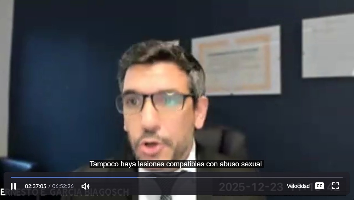 García Biagosh explicó: "La nota más resonante de esta pericia oficial es que el hecho fue inicialmente consentido. La sintomatología que advierte —ansiedad, insomnio, ataques de pánico— responde a la resignificación del hecho denunciado, no a un trauma original."