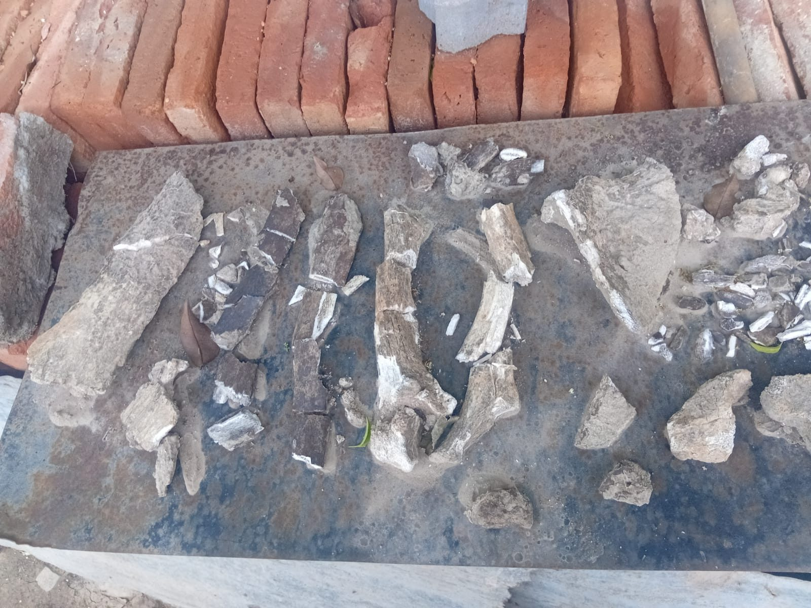 El material encontrado incluye diversos elementos óseos fragmentarios del poscráneo —entre ellos costillas, un hueso largo posiblemente perteneciente a un miembro posterior y un fragmento de pelvis— junto a tres placas óseas articuladas que aportan información diagnóstica relevante para su identificación taxonómica.