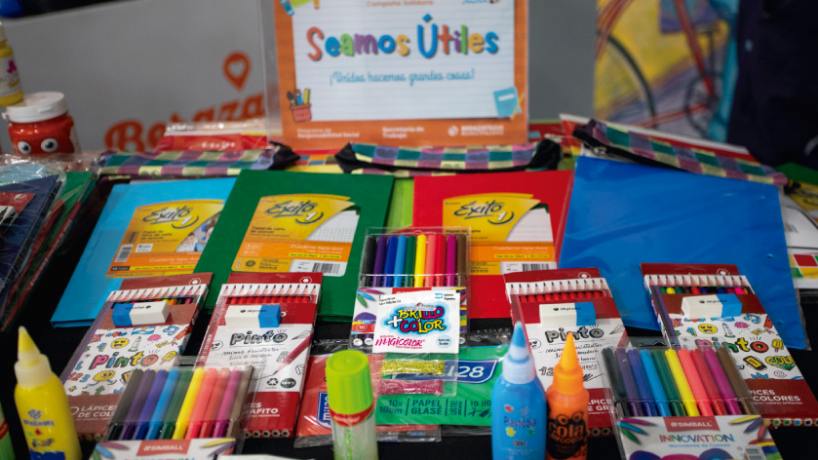 El kit incluye una mochila grande y 29 artículos esenciales para los niveles inicial, primario y secundario: carpeta, resaltadores, corrector, regla, aros de carpeta, cajas de lápices de colores y lápices negros, cartuchera, gomas, sacapuntas, lapiceras, tijera, separador, rótulo, cuaderno universitario de 100 hojas, marcadores, compás, repuesto de hojas, papel glasé, plasticola y acuarela, entre otros elementos fundamentales para el trabajo en el aula.