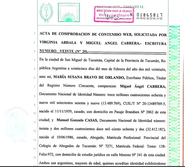 Carátula de la escritura N°20 que deja sentado el carácter del contenido web