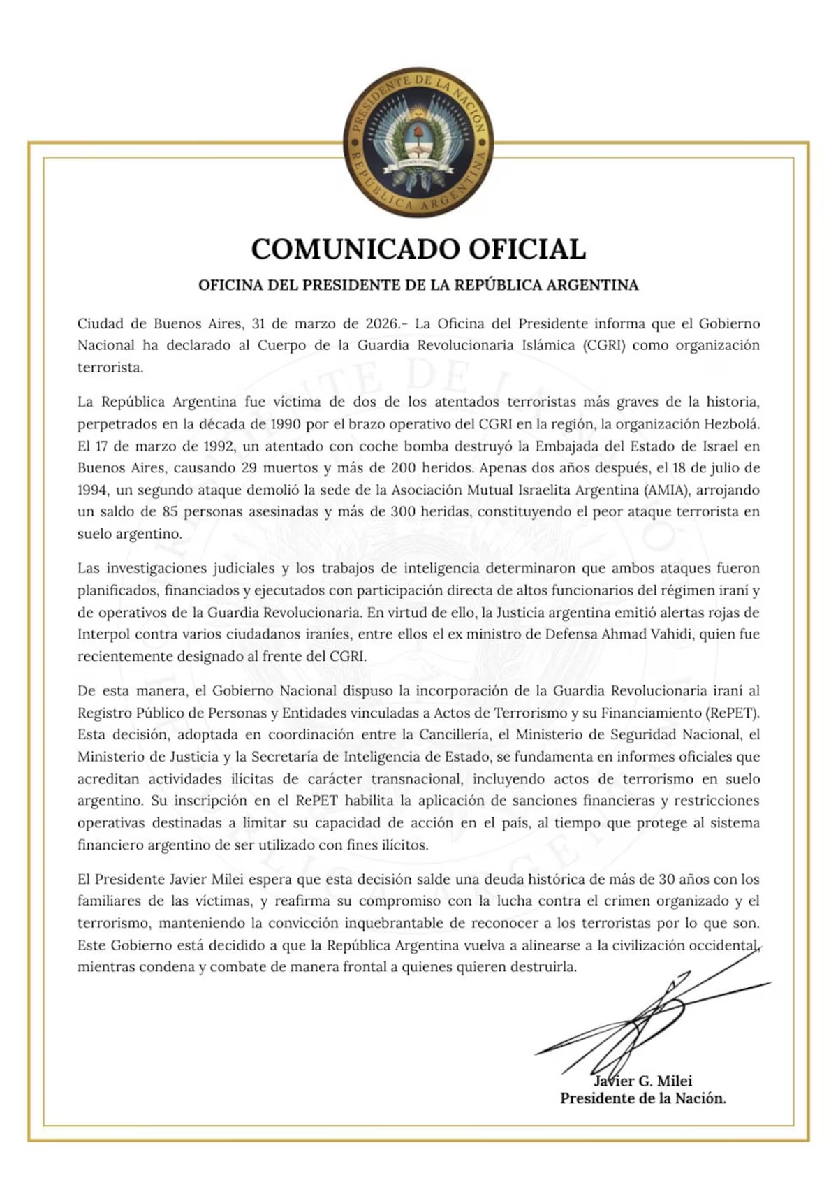En otro tramo, el comunicado introduce un elemento adicional de gravedad al señalar que “resulta particularmente grave la designación en cargos de alta responsabilidad del Cuerpo de Guardia Revolucionaria Islámica (CGRI) de personas requeridas por la Justicia argentina”.